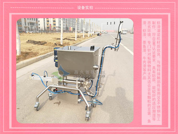 單頭配線魚滑灌裝機|蝦滑灌裝機是星火專利產品,采用全不銹鋼制作,方便清潔,衛生安全,該機設計合理,蝦滑灌裝機材質優良,與物料接觸部件采用304不銹鋼加工制作,符合GMP認證要求。具有防腐、能較好的適應潮濕等惡劣環境。專門針對粘稠物料尤其適合含有顆粒的豆醬、魚滑、蝦滑、墨魚滑、牛肉滑等產品,采用進口氣缸、電器元件,質量更穩定,配置靈活的腳踏開關和自動灌裝功能,急停開關等